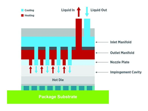厂商和测试操作人员还必须密切关注热管理。算力的提升不可避免地会加大散热需求压力,迫使业界采用更先进的散热方案,甚至可能在封装内部实施液冷(见图4)。封装内裸片越多,意味着测试机需要的资源也更多。更多晶体管则意味着更高的电源电流需求、更多的电源仪表和更严峻的热挑战。为此,业界必须采用创新的散热方案,并实施先进的自适应热控制(ATC)策略。